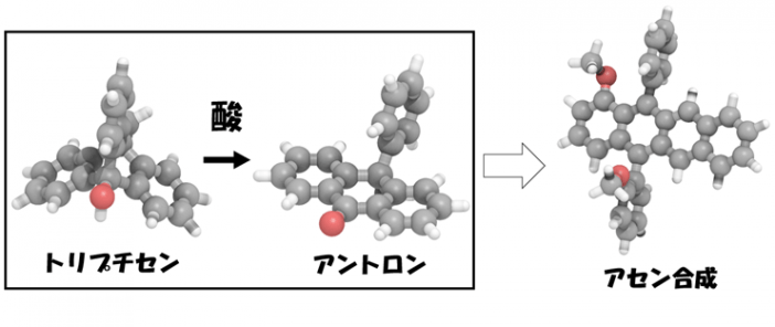 By simply mixing acid with triptycene, a propeller-shaped molecule with three blades of benzene rings, he discovered a reaction that removes only one of the three seams of the blades, and he successfully applied this reaction to the synthesis of acenes.